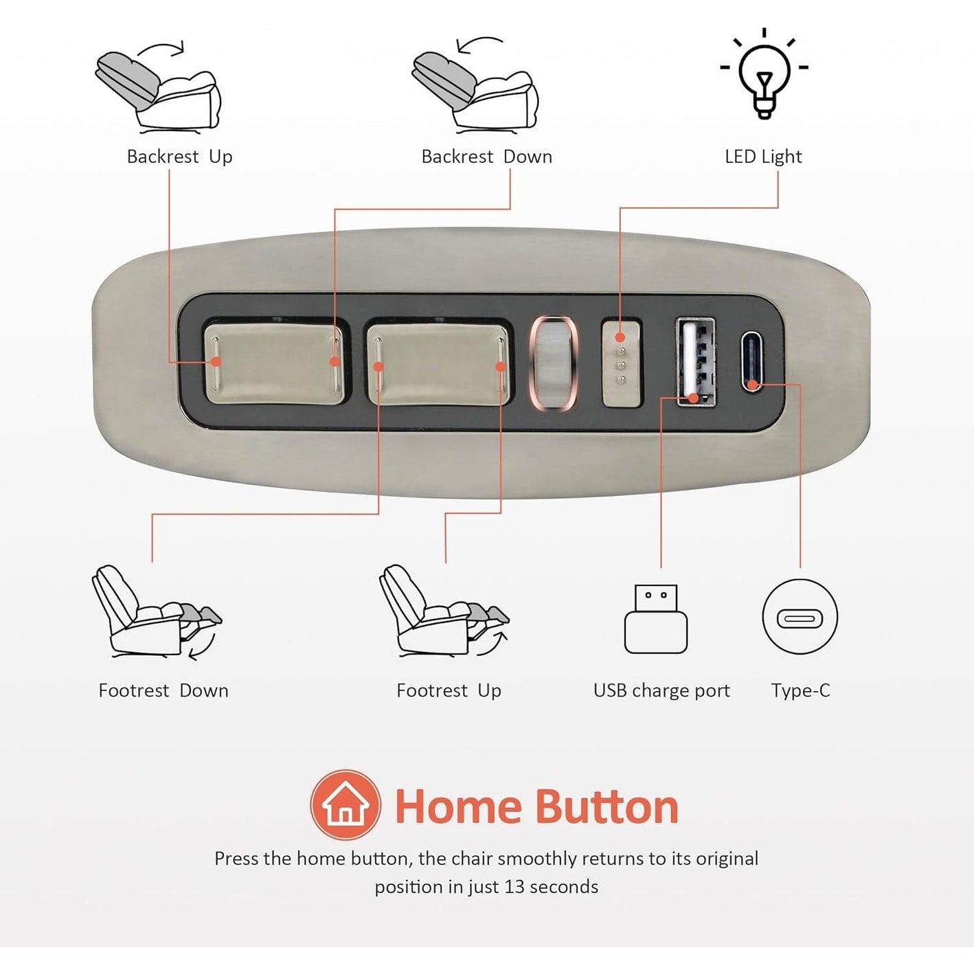• RÉINITIALISATION PAR UNE SEULE TOUCHE ET ÉCLAIRAGE LED. Appuyez sur le bouton d'accueil et le fauteuil revient en douceur à sa position initiale en seulement 13 secondes. Les deux ports USB et Type-C de l'accoudoir prennent en charge tous les téléphones et tablettes, et l'éclairage LED assure une détente optimale.