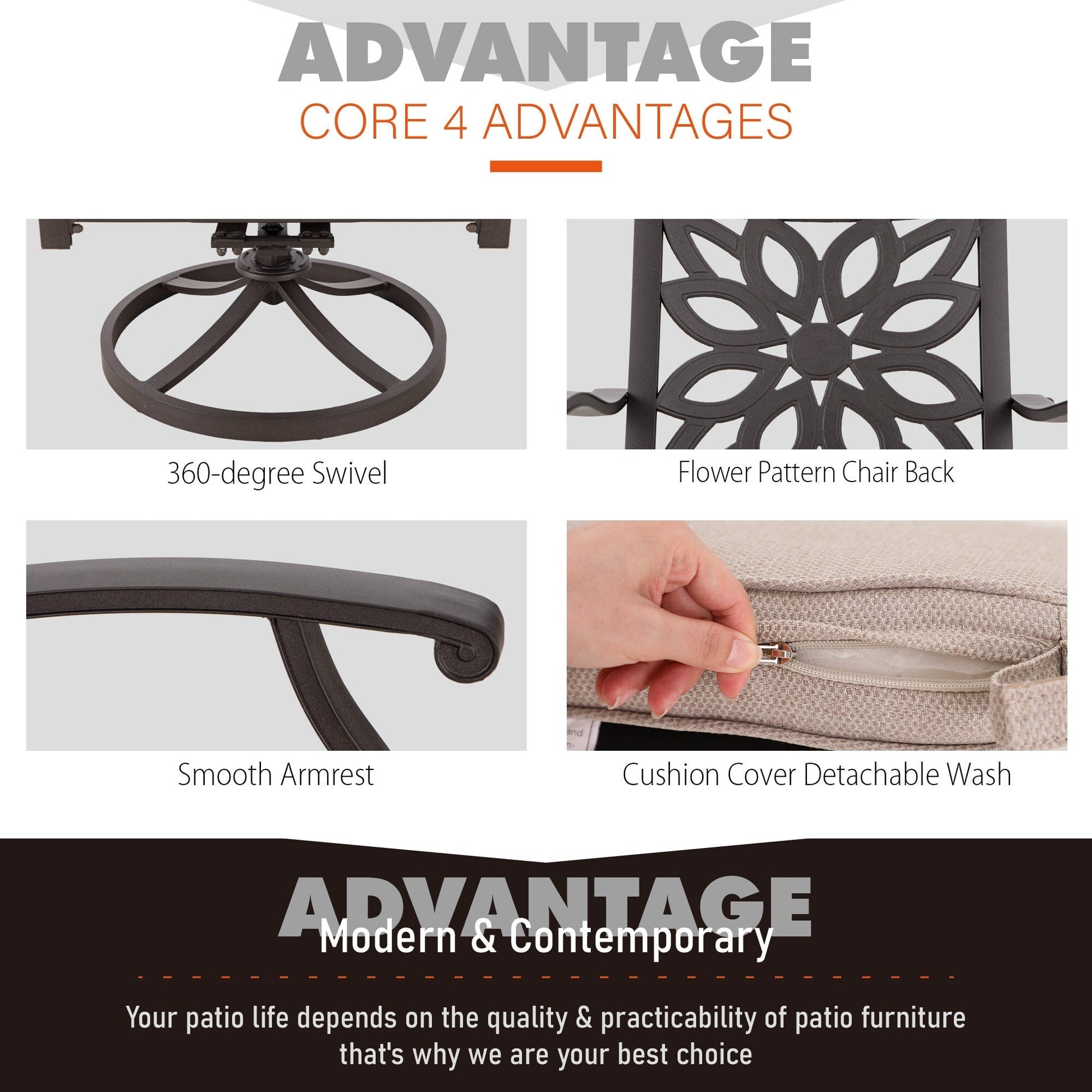 Cet ensemble de salle à manger de terrasse en aluminium moulé s'installe où vous le souhaitez dans votre maison. Il peut être installé à l'extérieur sans entretien et vous sera utile pendant de longues périodes. Vous pourrez y prendre le thé en famille ou entre amis, y manger, travailler ou lire un livre. Très pratique, il répond à tous vos besoins. C'est l'élément décoratif idéal pour votre intérieur.
