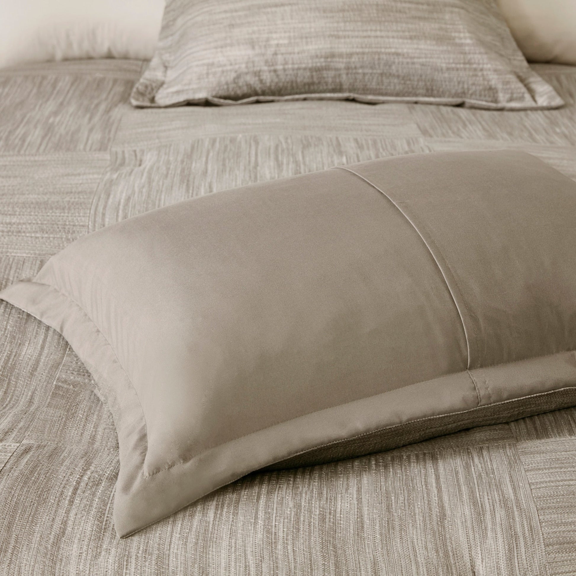 • Couette et taies d'oreiller assemblées, en microfibre douce brossée imprimée seersucker, envers uni en microfibre, garnissage 100 % polyester ; cache-sommier et oreillers en microfibre douce brossée